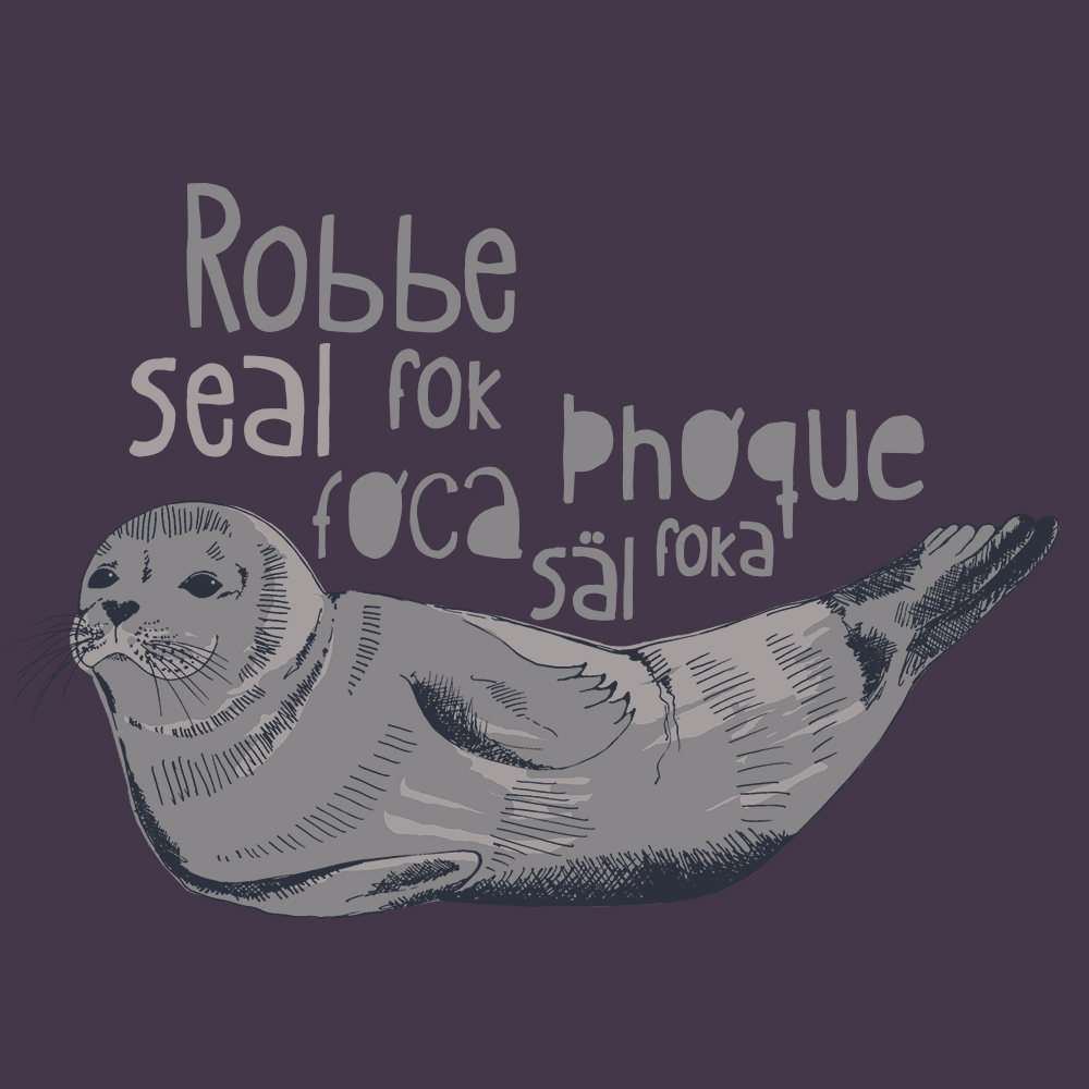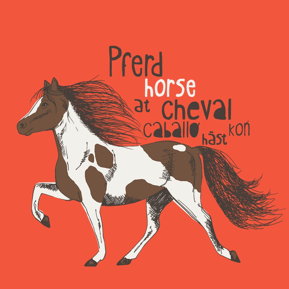 Tierarten in verschiedenen Sprachen begleiten typografisch die Zeichnungen für das Thema „Dictionary“.